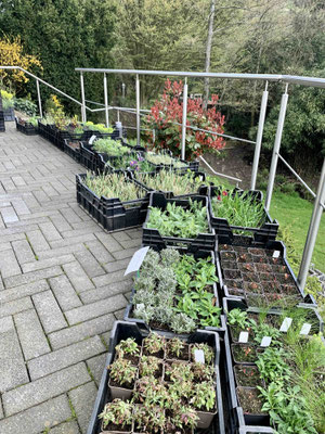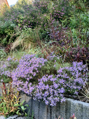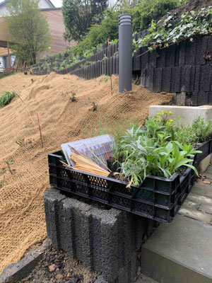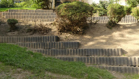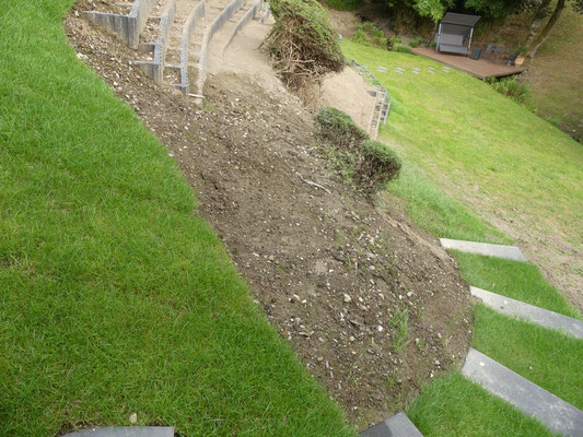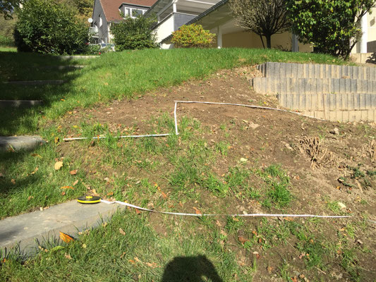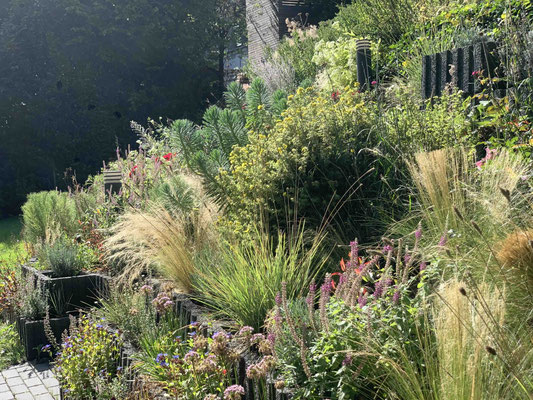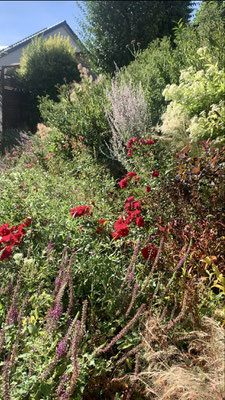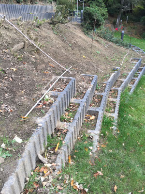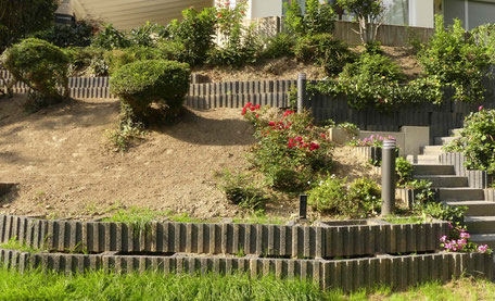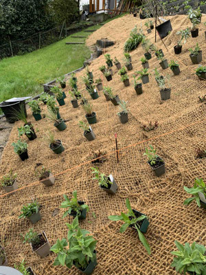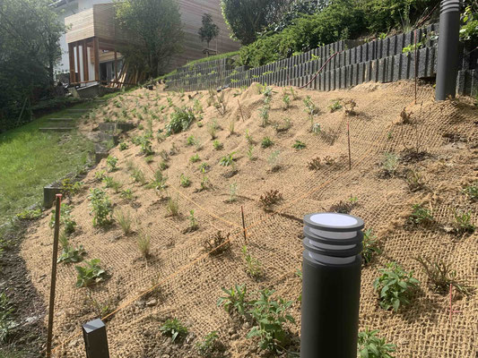 Eine pflegearme, robuste, naturalistische Bepflanzung, die sich in den Hangpflanzsteinen wohlfühlt, sich gegen Wurzel-Unkräuter wie Winde und Ackerschachtelhalm durchsetzt und im z.T. starken Gefälle möglichst schnell die Erosion eingrenzt. Außerdem sollte der Hang bald einen schönen Anblick für den im Tal gelegenen Sitzplatz bieten. Rote und rosa Rosen durften gerne bleiben und sich im Konzept wiederholen, die Immergrünen Altbestände wurden gerodet oder z.T. nur bodentief zurückgeschnitten, um den Hang zu stabilisieren.