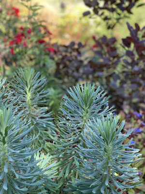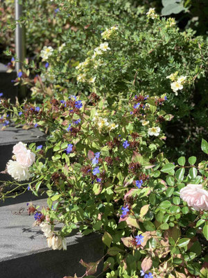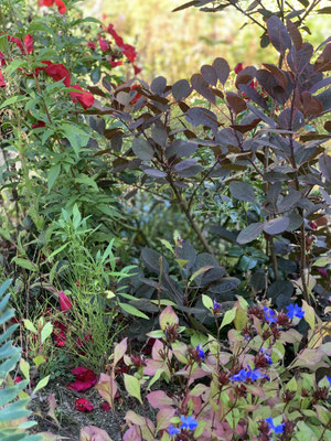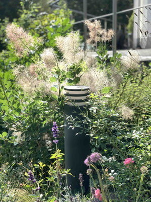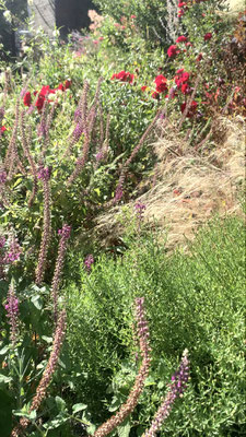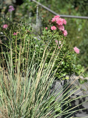 Basis ist die Kombination von roten Rosen, rotlaubigem Zwerggehölz, filigranem Haargras, vielen insekten- freundlichen Stauden (auch Kräutern) und immergrünen Halbsträuchern im Farbspektrum hauptsächlich weiß-rosé-pink-violett-blau, die den schwierigen Standort-Verhältnissen durch Wurzelstärke und Sonnenliebe trotzen und sich teilweise versamen.