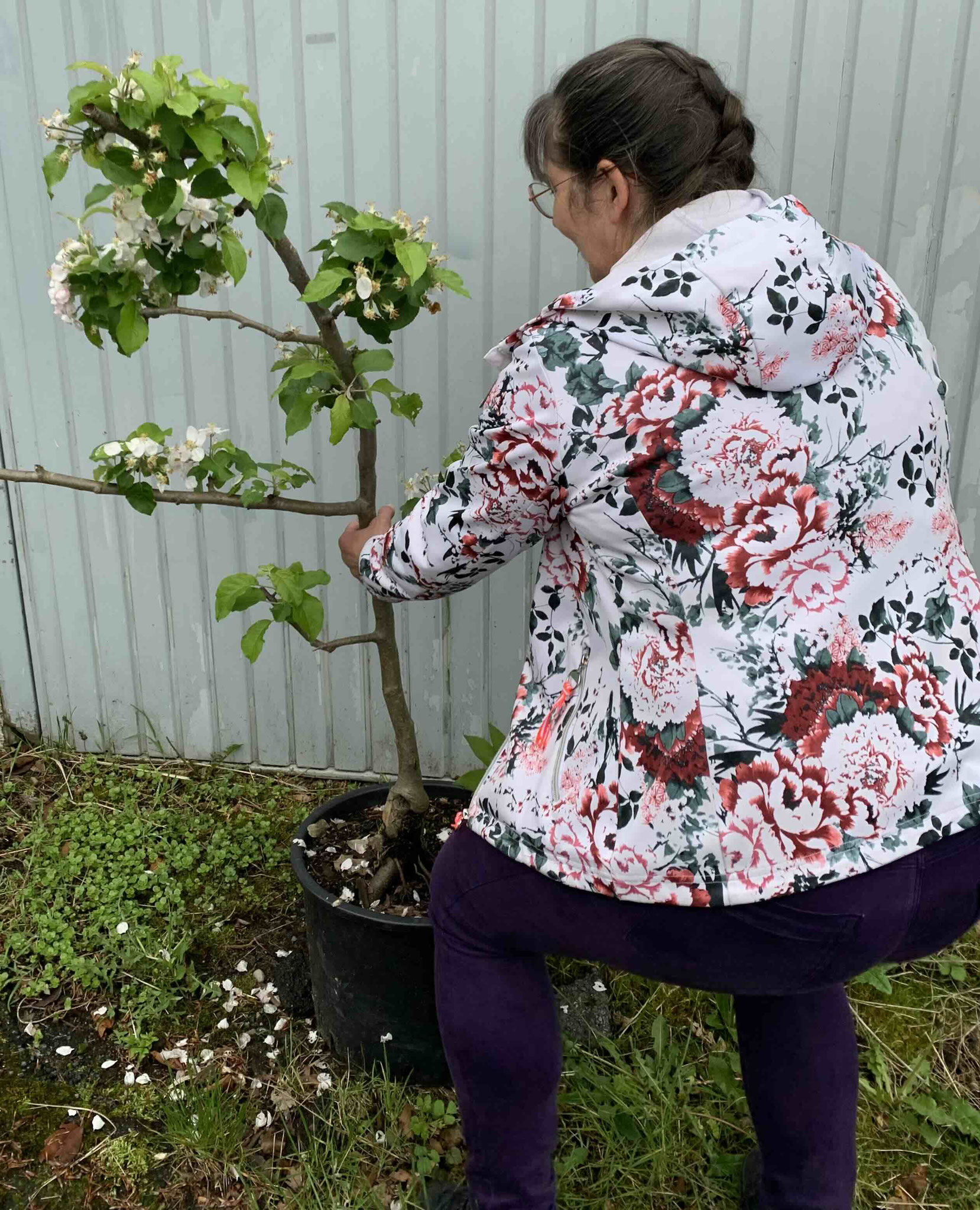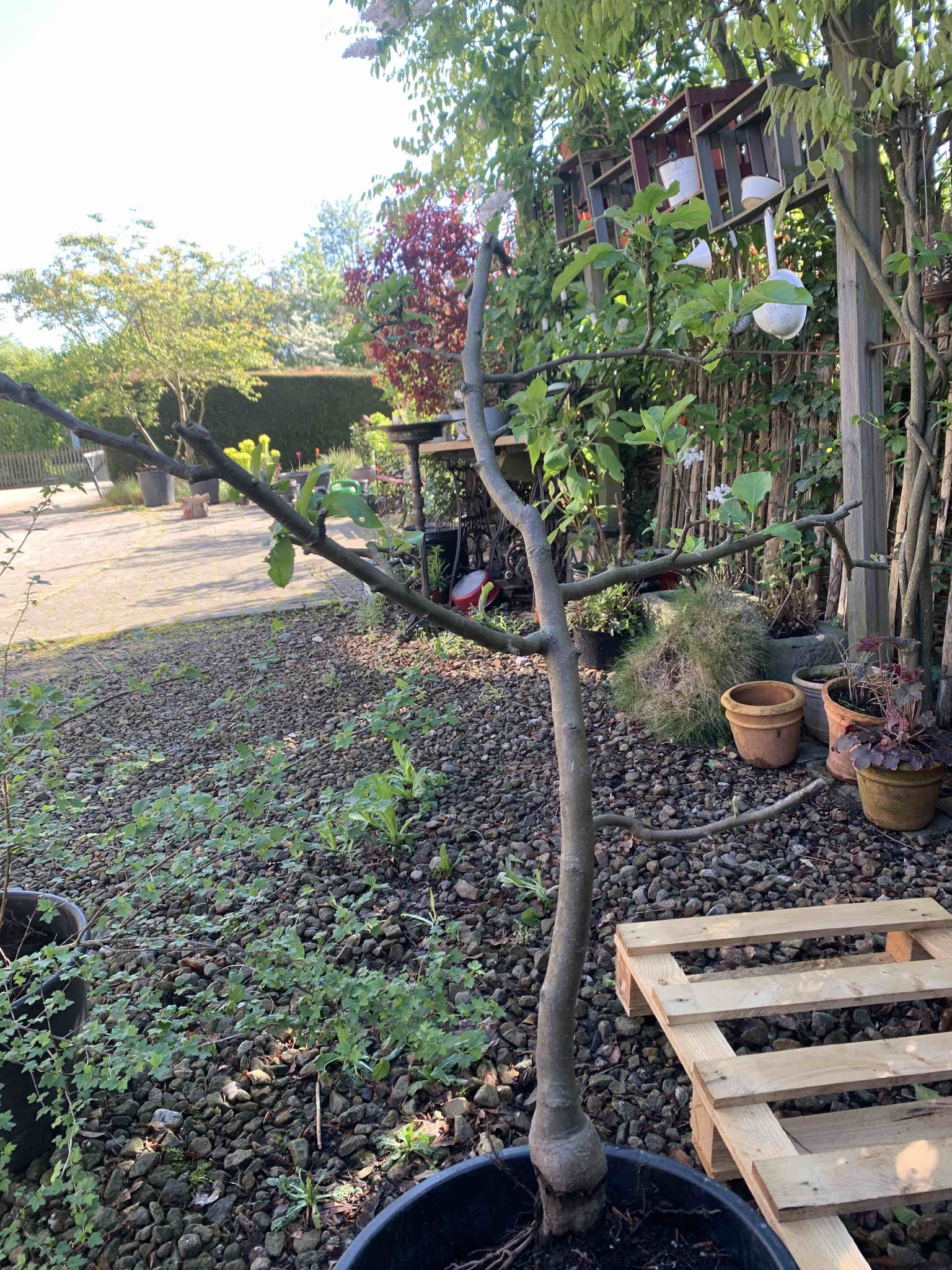 ca. 100 cm im Topf, treibt schön aus, muss durch kontinuierlichen Schnitt weiter erzogen werden, wunderbare Blüte Apr25